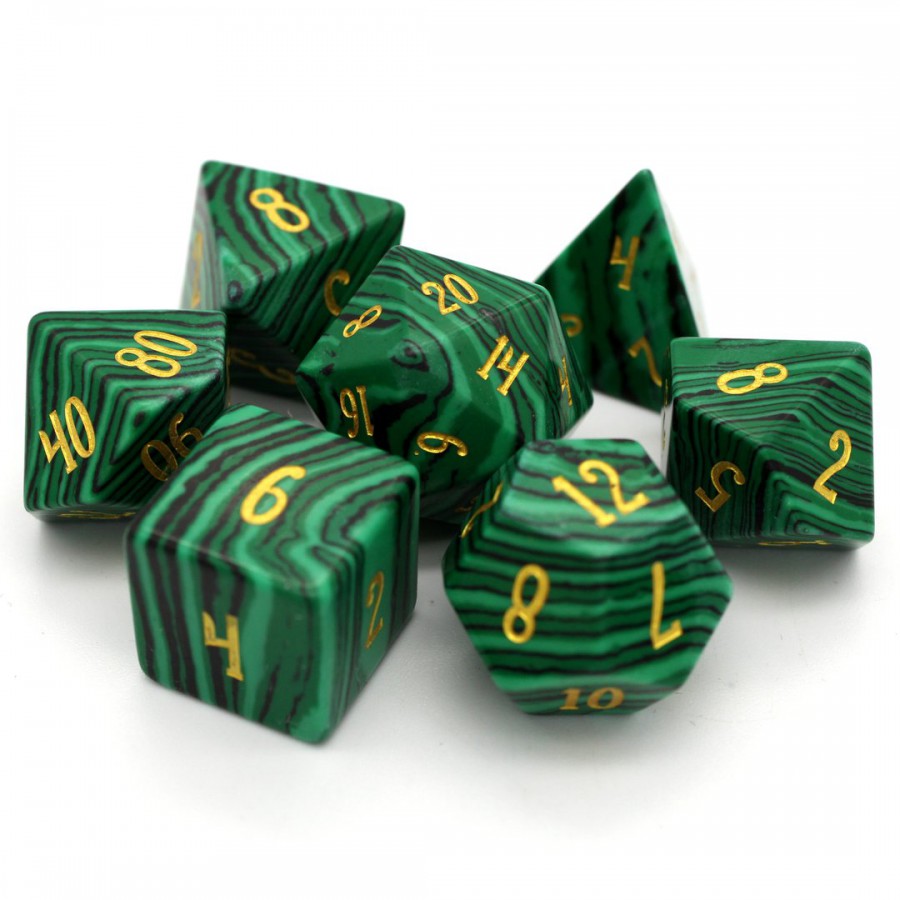 Enjoy these gorgeous inlaid gemstone dice with bright gold numbering! (Pro tip: roll this precious artifacts in a dice box!)