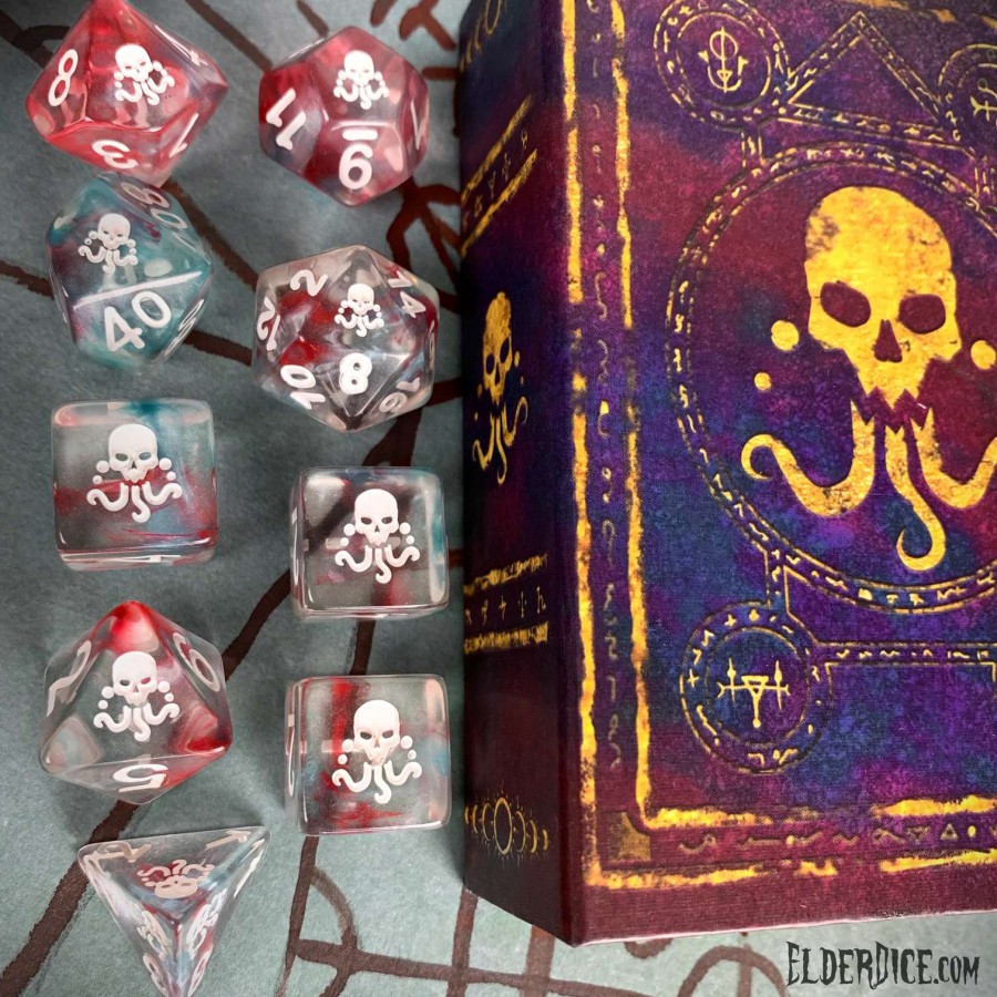 Each set of Elder Dice contains the complete set of nine polyhedral gaming dice: 1 four-sided die, 3 six-sided dice, 1 eight-sided die, 1 ten-sided die, 1 ten-sided percentile die, 1 twelve-sided die, and 1 twenty-sided die.