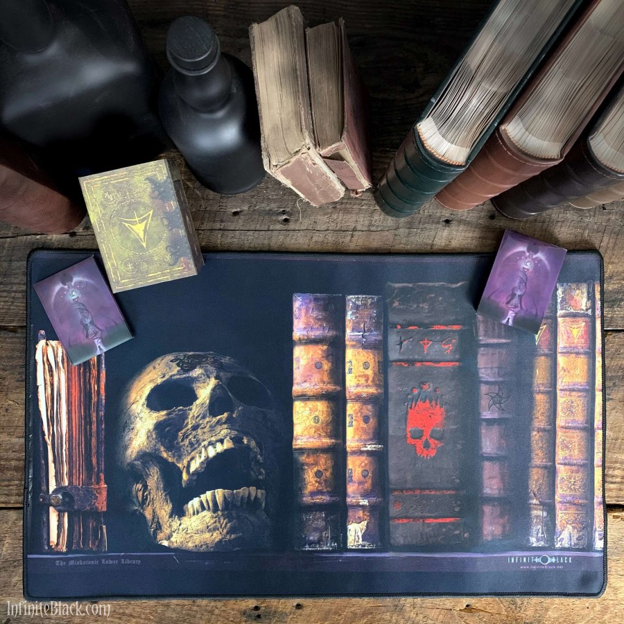 This playmat features the art “Miskatonic University’s Lower Library” by David LaRocca. It measures 24 inches by 14 inches and is a fabric surface with a durable rubber backing and premium stitched edge.